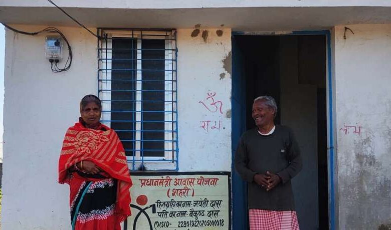 रायपुर : जन्म से मूक-बधिर रहे दंपत्ति को मिला उनका आशियाना जन्म से मूक-बधिर रहे बैकुंठ दास और जयंती कोे रोजमर्रा की चीजों के लिए ही मशक्कत करनी पड़ती थी, ऐसे में उनका अपना पक्का घर बना पाना तो नामुमकिन ही था। उन्हें कच्चे मकान में अनेक समस्याओं का सामना करना पड़ता था, लेकिन अब वे अपने प्रधानमंत्री आवास योजना के तहत बने नए पक्के आवास में सुरक्षित और आरामदायक जीवन जी रहे हैं, जिससे उनकी जीवनशैली में बहुत बड़ा बदलाव आया है।